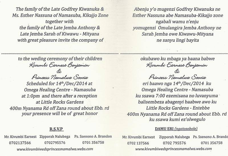 In other development HICGI News Agency & Heal The Planet Global Organisation -HTP can reveal with confidence after being alerted that top politicians, top news editors and journalists, city tycoons and business men, religious leaders, educationists, musicians, diplomats as well as State House, office of the president and government officials have confirmed there presence at Kivumbi Princess Namalwa wedding tomorrow 14th December 2014.