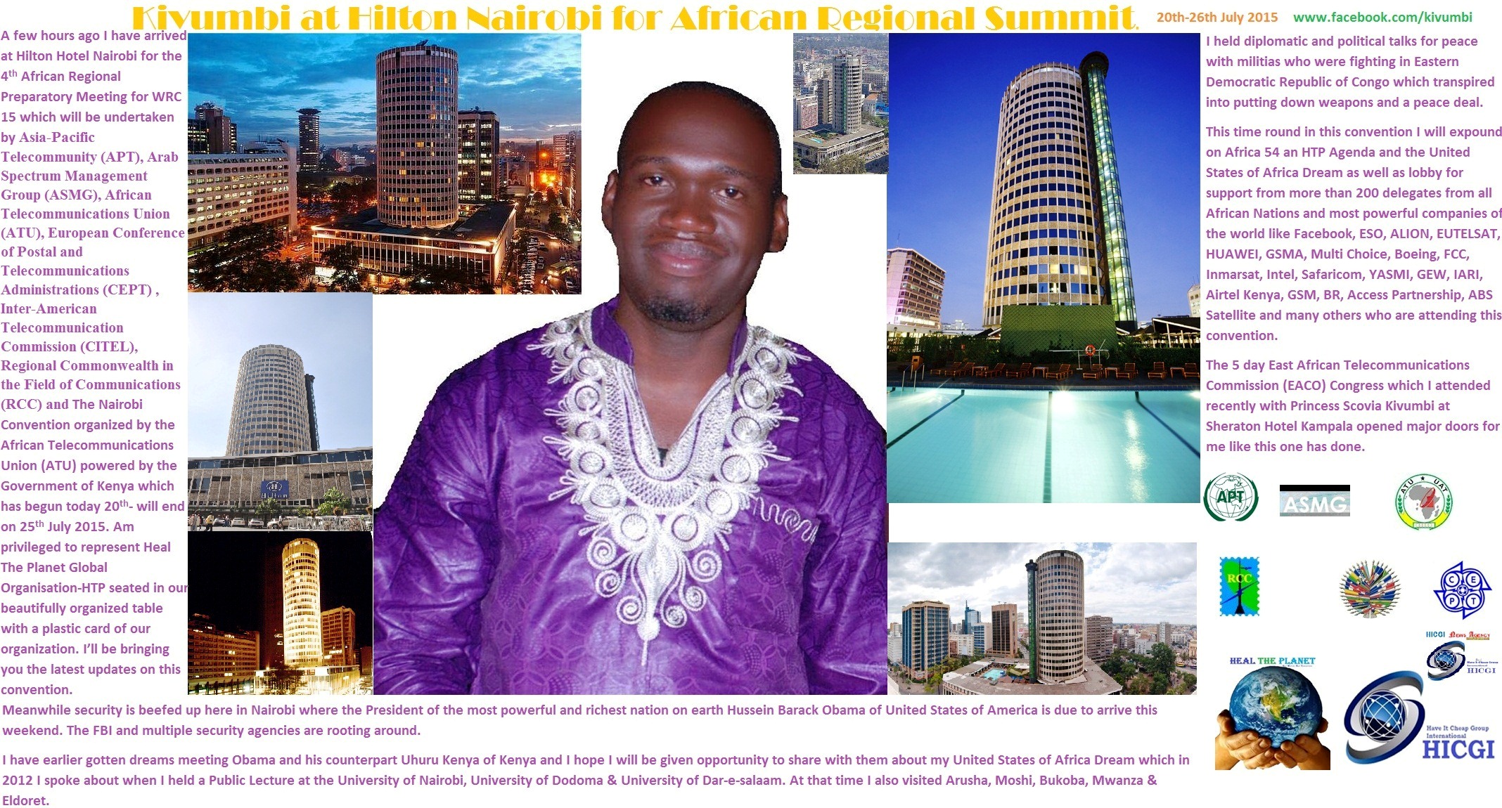 The Nairobi Convention organized by the African Telecommunications Union (ATU) powered by the Government of Kenya which has begun today 20th– will end on 25th July 2015. Am privileged to represent Heal The Planet Global Organisation-HTP seated in our beautifully organized table with a plastic card of our organization. I’ll be bringing you the latest updates on this convention.