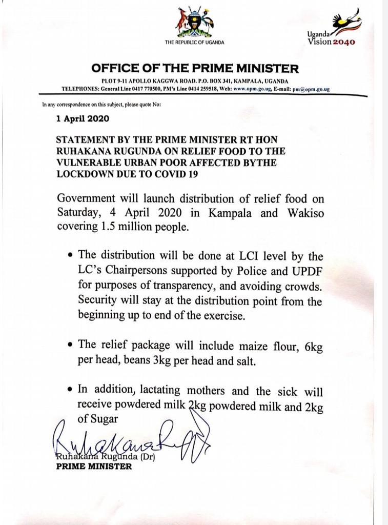 The government of Uganda has released a statement indicating that starting this weekend citizens will be getting free food as part of responding to Corona Virus Pandemic effects.