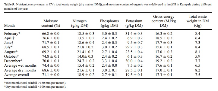 This could probably be 460 explained by a wider variety of foodstuffs being consumed during the festive season, including food with high protein content such as meat. Amoding (2007) established that market wastes in Kampala city contain on average 1.57% nitrogen, 0.21% phosphorus, and 465 2.95% potassium. Comparing the present results with those, it can be seen that results of this study for the dry months were fairly similar, confirming our assumption that crop waste dominated the organic waste fraction generated in the dry months. Cofie et al. (2009) reported the quality of co-compost from a 470 pilot plant using fecal sludge and organic waste in Kumasi, Ghana, to be 1.19% nitrogen, 1.6% phosphorus, and 1.7% potassium. Comparing the results of Kampala with those from Kumasi, it can be concluded that it is possible to get a superior quality of co-compost from municipal waste in Kampala. 475 The average gross energy content of the organic factions was 17.3MJ/kg DM (Table 5).