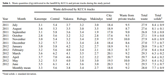 We thank Swedish International Development Cooperation Agency (SIDA) and the Swedish Foreign Affairs Ministry (UD40) for initiating the collaboration and sponsoring the research. We thank KCCA staff members, especially Kenneth 530 Kyazze, for all the assistance rendered in the physical characterization of waste at the Kiteezi landfill. We also thank the College of Agriculture and Environmental Sciences, Makerere University, for provision of laboratory services. References 535 Amoding, A. 2007. Supply potential and agronomic value of urban market crop waste. PhD Thesis, Makerere University. Banadda, E.N., F. Kansiime, M. Kigobe, M. Kizza, and I. Nhapi. 2009. Landusebased nonpoint source pollution: A threat to water quality in Murchison Bay, Uganda.