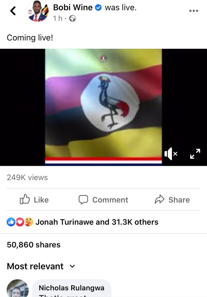 As Museveni addressed the nation, Bobi Wine also took him up on facebook live attracting 21,000 viewers during the address but total views rose to 250,000 with more than 50,000 shares and 80,000 comments latter.