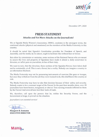 KAMPALA- Uganda Media Women’s Association, UMWA has joined organisations and activists condemning the continued attacks on journalists in Uganda. In consensus yesturday, scores of journalists walked out in protest from Uganda Media Centre Press briefing by security chiefs.