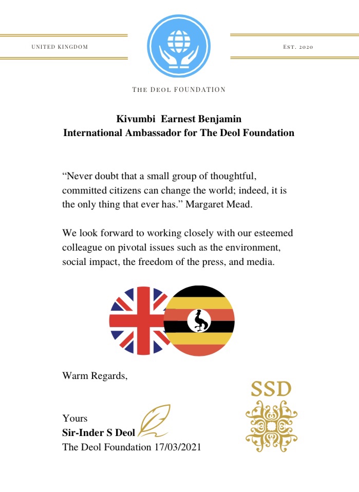 “I have been asked by my friend and colleague Sir-Inder Deol from the United Kingdom to become an International Ambassador of The Deol Foundation. I am honoured and look forward to working on many exciting projects together in the future” Kivumbi Earnest Benjamin.