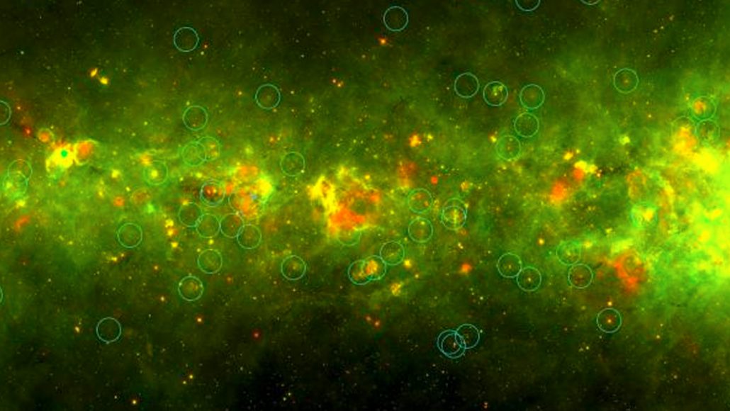 Volunteers with the Milky Way Project first identified the objects while scouring pictures of the galaxy taken by the Spitzer Space Telescope. The now-defunct observatory saw the cosmos in infrared light, which let astronomers take a sort of stellar ultrasound “to probe what’s going on in these cold environments before the stars are actually born,” says Wolf-Chase.
