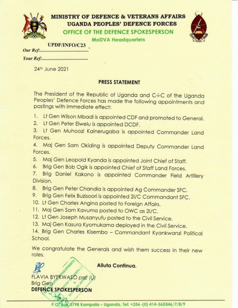 According to a statement released by the Ministry of Defense; newly appointed General Wilson Mbadi is the new Commander of Defense Forces deputized by Lt Gen Peter Elwelu