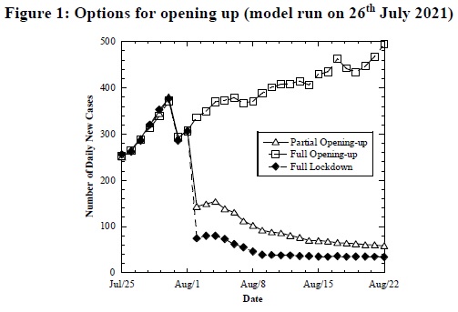They looked at 3 options to analyze how the current cases that average 300 per day might increase or decrease based on either; full opening up (zero lockdown), no opening-up (Full Lockdown), or Partial opening-up.