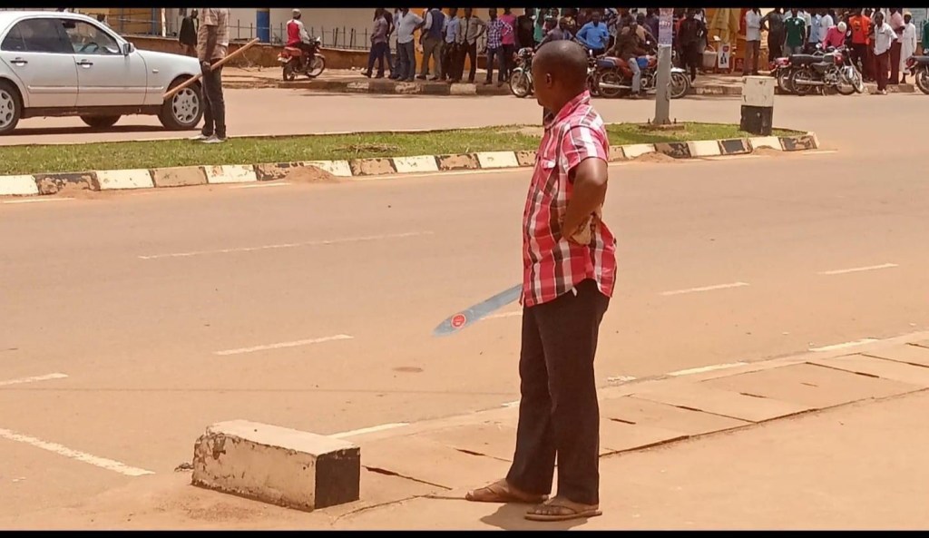 The incident happened on Republic street just close to Mbale City Council offices and post office Uganda where the panga welding goons attack the Nulu employers by throwing stones at them and swearing to shed blood should they cross the red line .