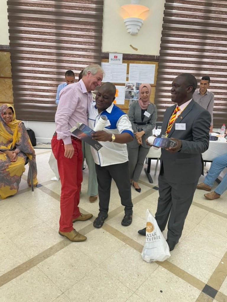 ASToN official Thierry receives a gift from KCCA official John Mary Ssebuwufu as Kivumbi Earnest Benjamin looks on. Courtesy Photo