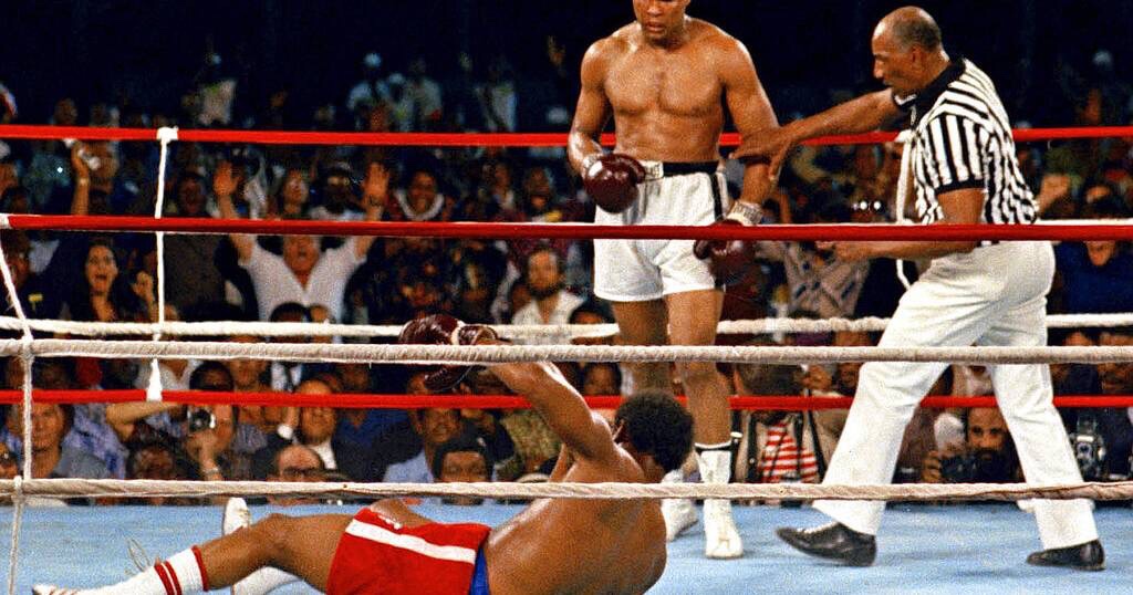 This is a Oct. 30, 1974 file photo of Muhammad Ali, right, as he stands back as referee Zack Clayton calls the count over opponent George Foreman, red shorts, in Kinshasa, DRC – Copyright © africanews Anonymous/1974 AP