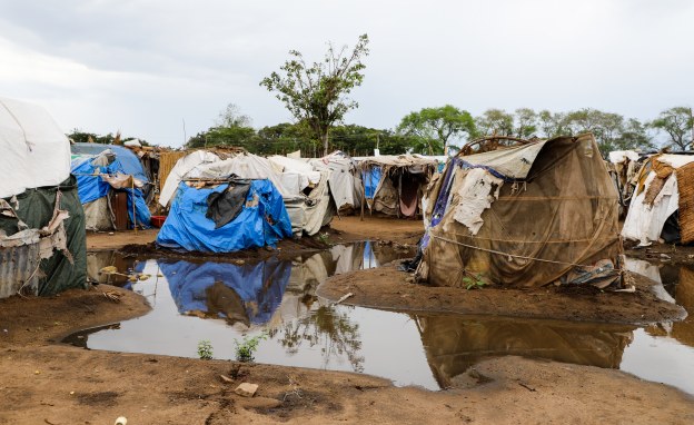 Makeshift tents surrounded by water at Kigaramango IDP camp. Displaced persons have been living in this camp since the floods in Gatumba in April 2020. This camp has been completely flooded in May 2021 and people who were still living there were displaced to another