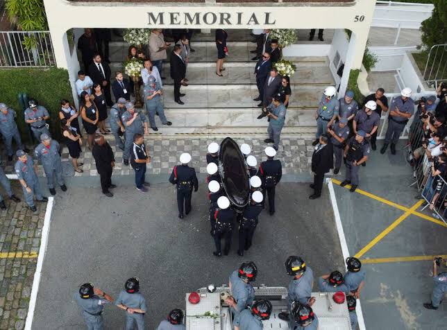 His body was then accompanied for seven kilometres through the streets of Santos while helicopters flew overhead. His coffin was carried on a fire engine, as is traditional in official parades.