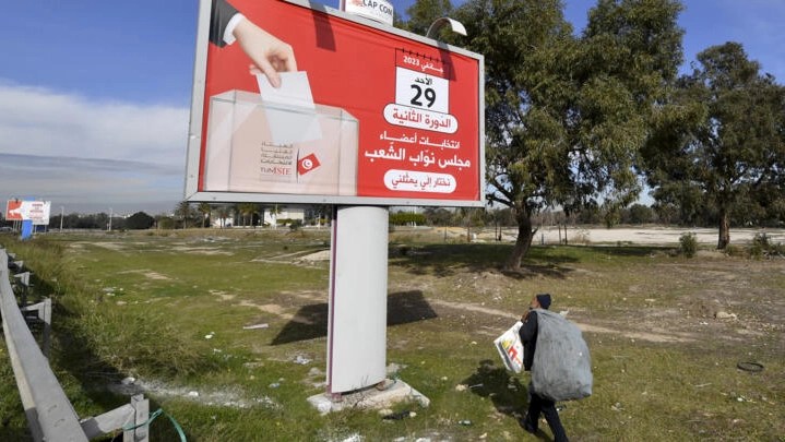 A man walks past an electoral billboard for the Tunisian national election scheduled for January 29, in Tunisia’s capital Tunis, on January 25, 2023.