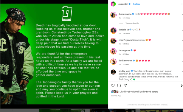 Costa’s death comes a month after the death of award-winning rapper Kiernan Forbes popularly known as AKA.