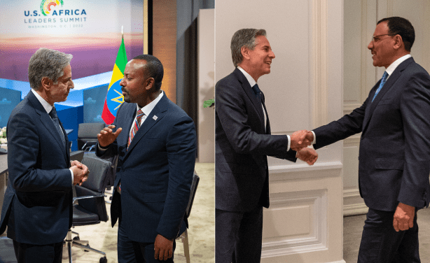 Secretary of State Antony J. Blinken with Ethiopian Prime Minister Abiy Ahmed at the U.S.- Africa Leaders Summit in December 2022 and Nigerien President Mohamed Bazoum at the United Nations in September 2022.