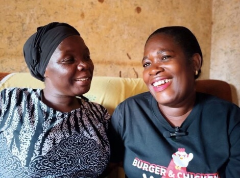 Dorothy Nankinga (L) and Milly Nazziwa at their home in Kireku village, Wakiso district, Uganda, on June 22, 2023. The co-wives say they are best of friends and their children have followed suit.