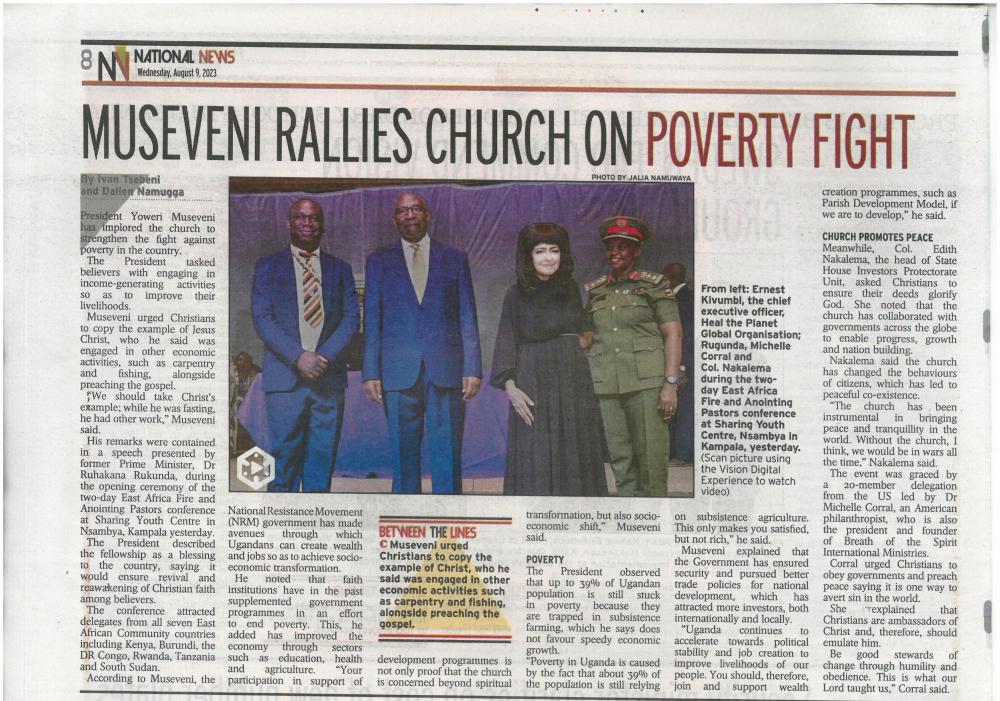 I take this opportunity to thank Dr. Michelle Corral, the President and Founder of Breath of the Spirit Ministries, for inviting me to officiate as Chief Guest, at the East Africa Fire and Anointing Pastors Conference. I have not been able to join you physically, due to earlier scheduled engagements. I have, however, asked The Rt. Hon Ruhakana Rugunda, to represent me and deliver my message to you.