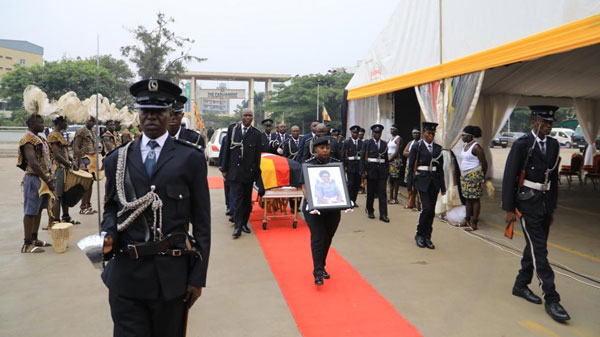 The casket, accompanied by pallbearers from the Uganda Police Force was received by Speaker of Parliament, Anita Among, and other Members of Parliament. The casket now lies at the Central Lobby where Members of Parliament and other mourners will view the body and sign the condolence book.