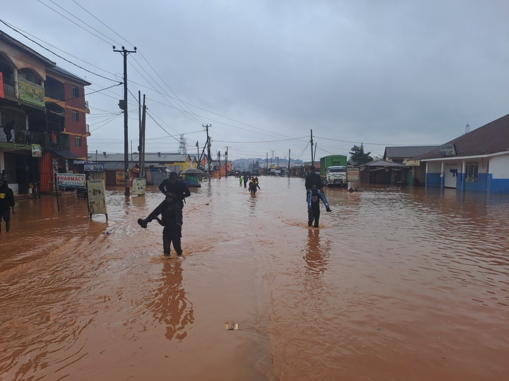 Road users are finding alternative means with pedestrians paying bodybuilders carrying then to across the flooded roads.