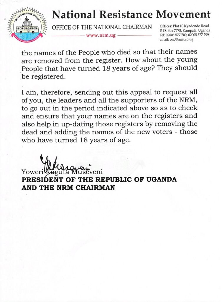 In a message shared on his X account, President Yoweri Museveni called on leaders and supporters of the National Resistance Movement (NRM) to ensure their names are correctly updated on the registers. He also emphasized the importance of removing the names of deceased individuals and registering new voters who have reached the voting age of 18.