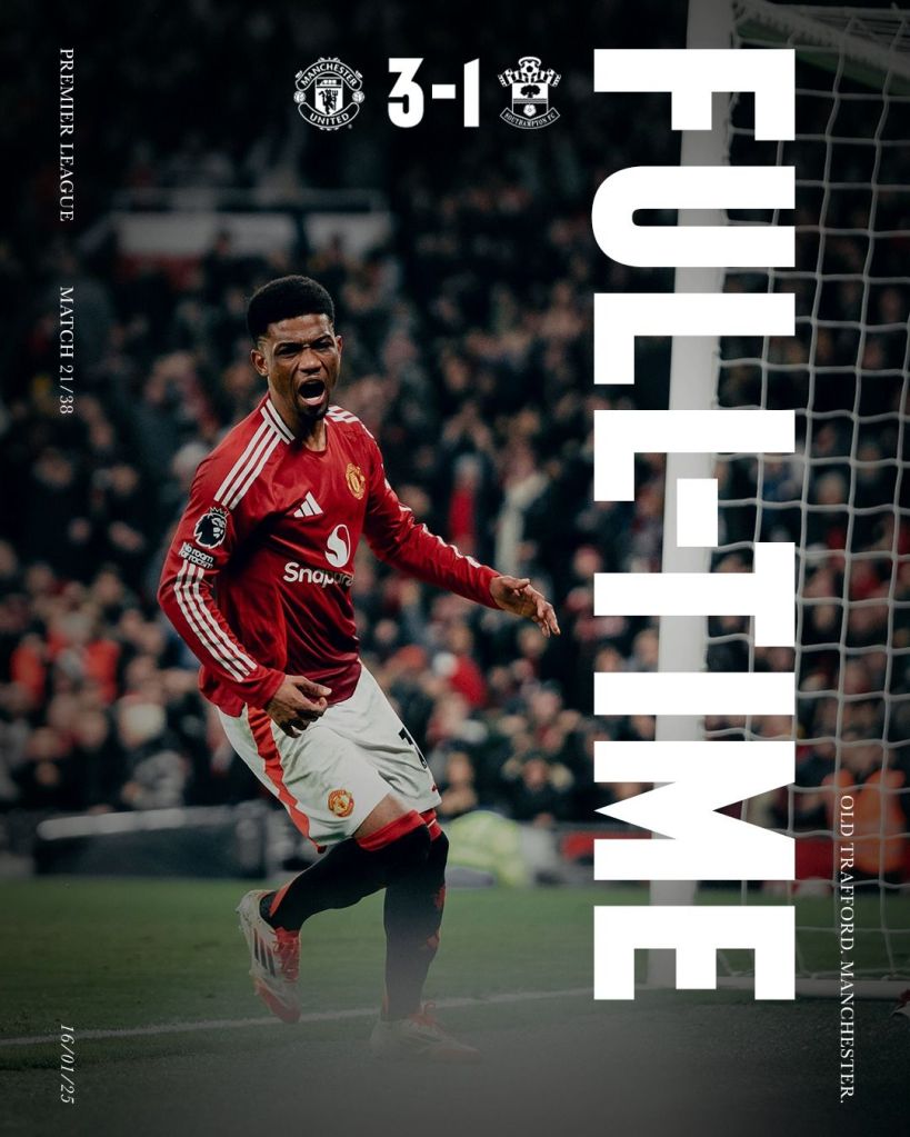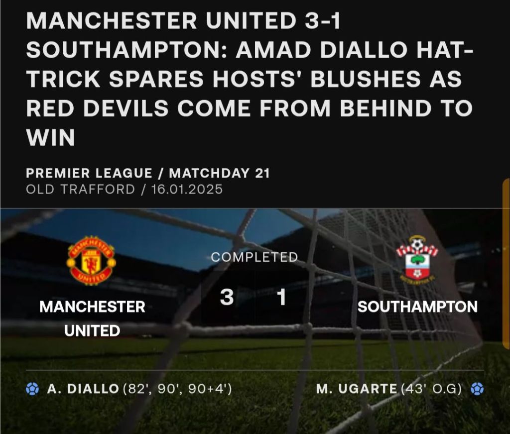 Amad Diallo’s sensational late hat-trick shattered Southampton’s hopes, securing Manchester United a 3-1 comeback victory and avoiding what could have been a fourth consecutive home defeat.