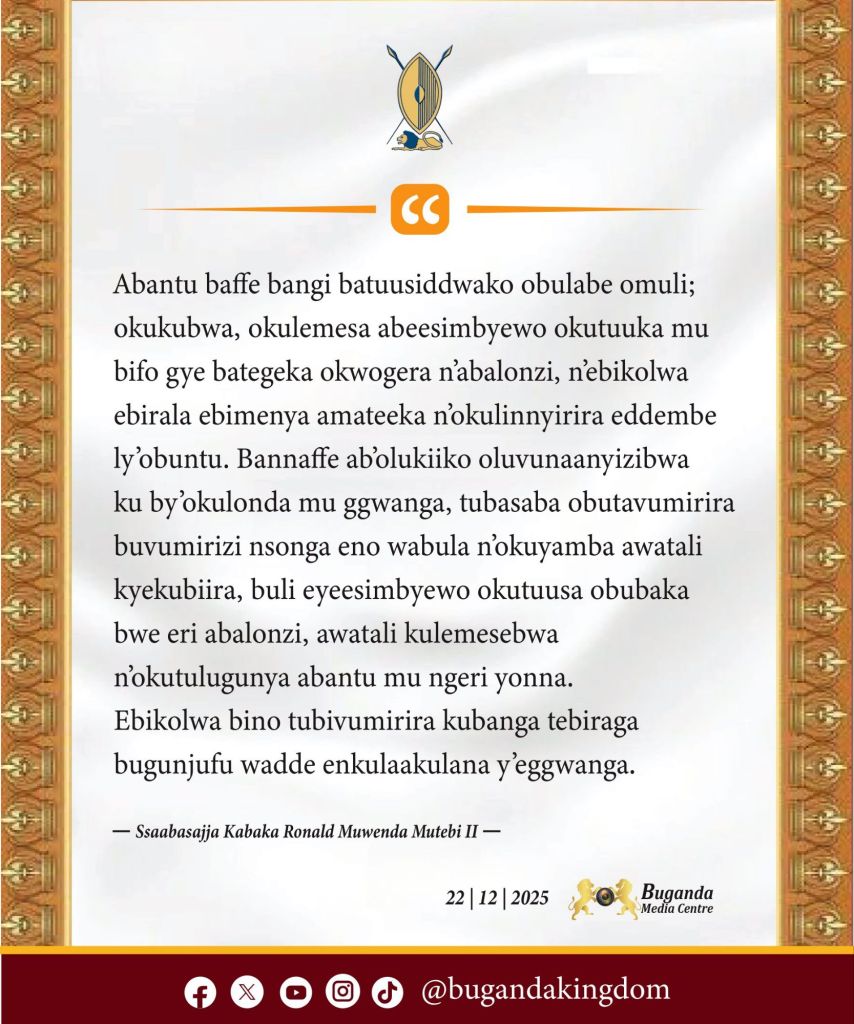 His Majesty the Kabaka of Buganda, Muwenda Mutebi II, has issued a Christmas and New Year 2026 message, thanking the people for their prayers and expressing concern over rising political violence, economic pressures, food insecurity, and insecurity affecting communities across the country.
