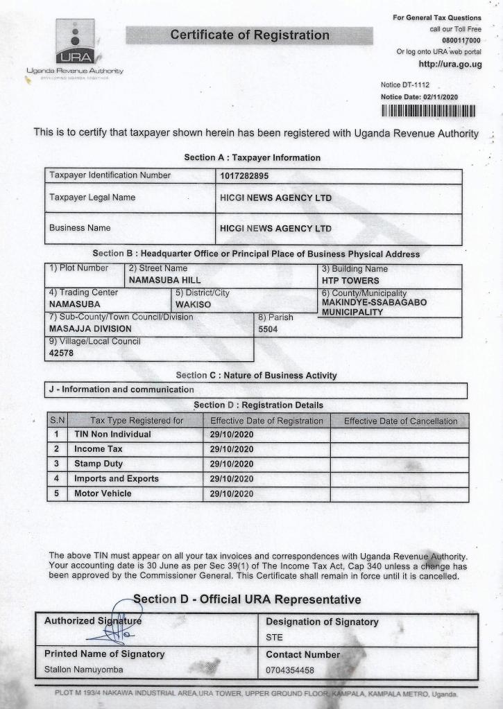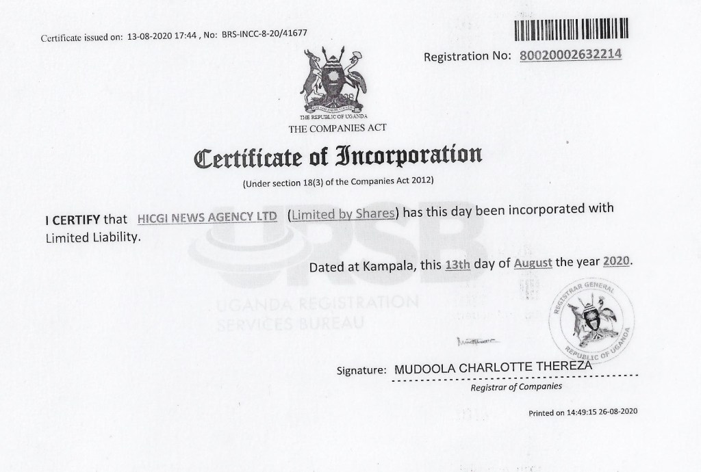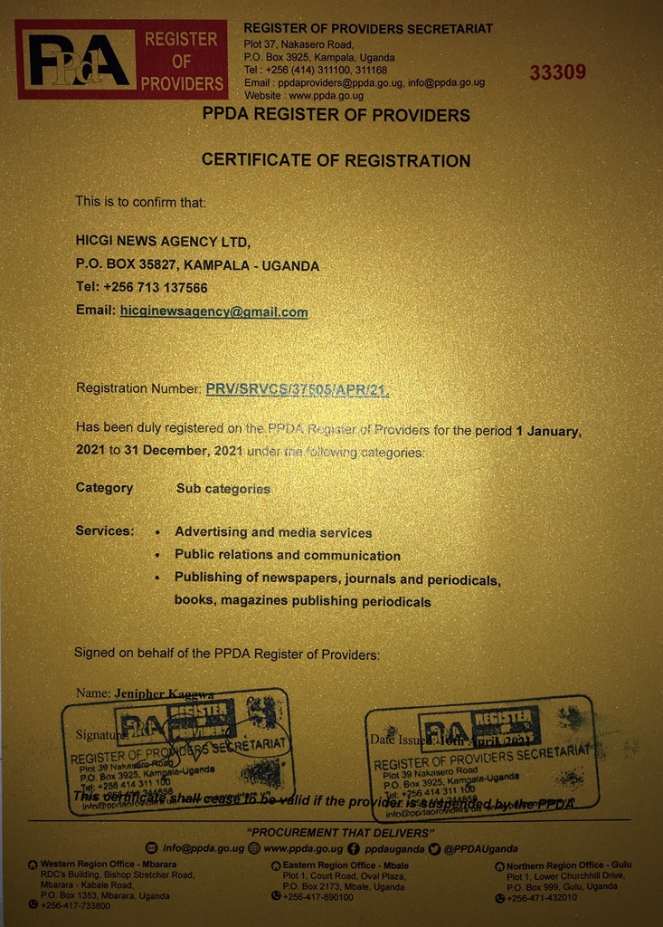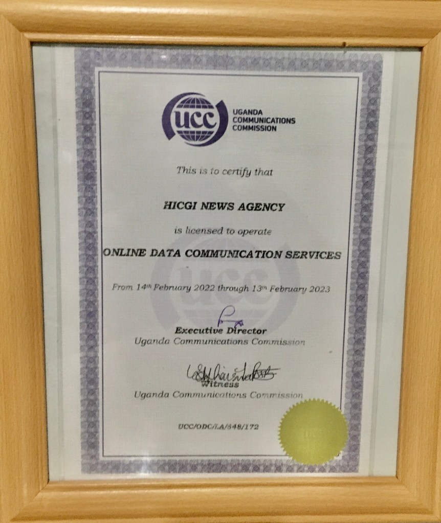 Uganda Communications Comission- UCC License for HICGI News Agency